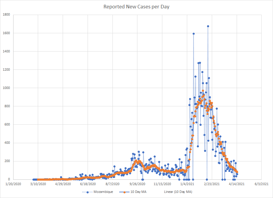 And among the places where cases dropped during this time period are Mozambique, Nigeria, Zambia, Ghana and the Ivory Coast. I’ll use Mozambique as an example since it was one of the places that looked really bad at the beginning of the year and you can see that the wave has come and gone.