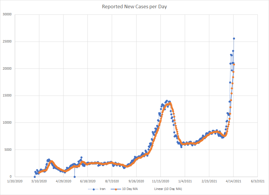 In the Eastern Med region, most of the countries saw an increase. Among the biggest are Iran, Pakistan, Tunisia and Oman. I’ll pick Iran as the example. This is one of those scary graphs. Everything seemed to be fine until late March and then we kicked off another exponential growth phase. Typically, those run from four to six weeks so cases may continue to go up here until at least the end of April which means we may see this graph again when I take another look at the end of April.