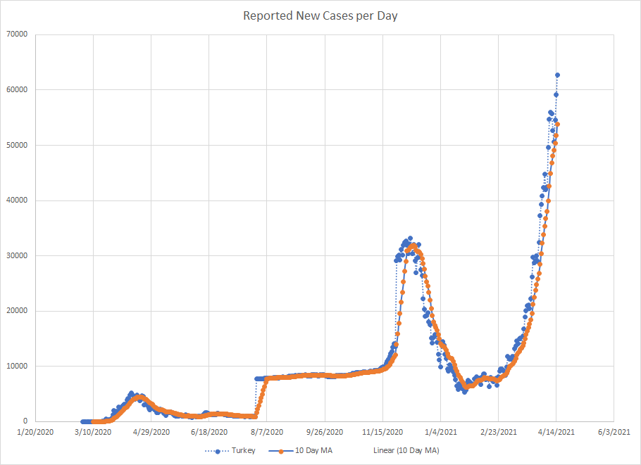 Lots of places in Europe were up the last time I looked at this and many of them still are. France and Poland still rank high in terms of the number of cases but have smaller percentage increases. There were big percentage increases in Azerbaijan, Kazakhstan and Croatia but they rank behind the other places in terms of actual cases. Others that rank high in one or the other include Germany, Ukraine, Sweden and Spain, But Turkey is clearly the worst in this group and they are the example I’ll use. Cases here have been going up since late February which hopefully means the current wave is near the end.