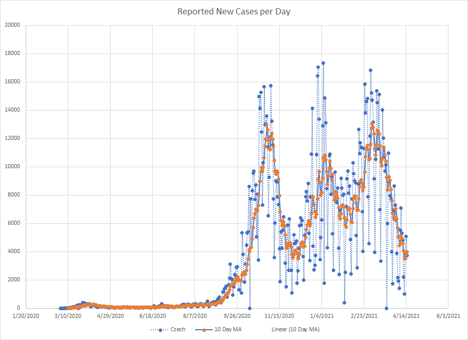 There aren’t a lot of places with really big drops here but among the places with improving conditions are Italy, Czechia, the UK, Hungary, Russia, Slovakia and Estonia. I looked at Czechia last time but they seem like the best example to use here as well. Cases peaked here in earl March and have been on the decline since then.