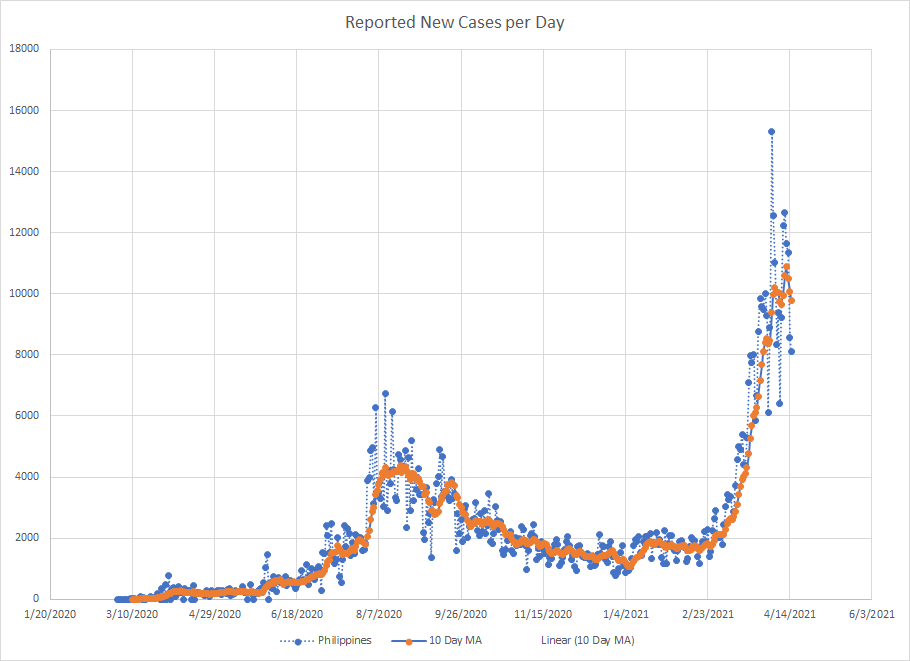 The next two regions are small in terms of countries. In the SE Asia, we had big increases in India, Bangladesh, Thailand and Nepal. I don’t really have a place that shows what looks like a big decrease. And in the Western Pacific, the biggest increases were in the Philippines, Japan and Mongolia and, again, we don’t really have a place with a big decrease. We do have places where the cases are flat or declining but not really by enough to be interesting. I mentioned India earlier and they’ve jumped back over Brazil to take second place in the world for number of cases so I show a graph for them. And I’ll show the Philippines to represent the Western Pacific Region.