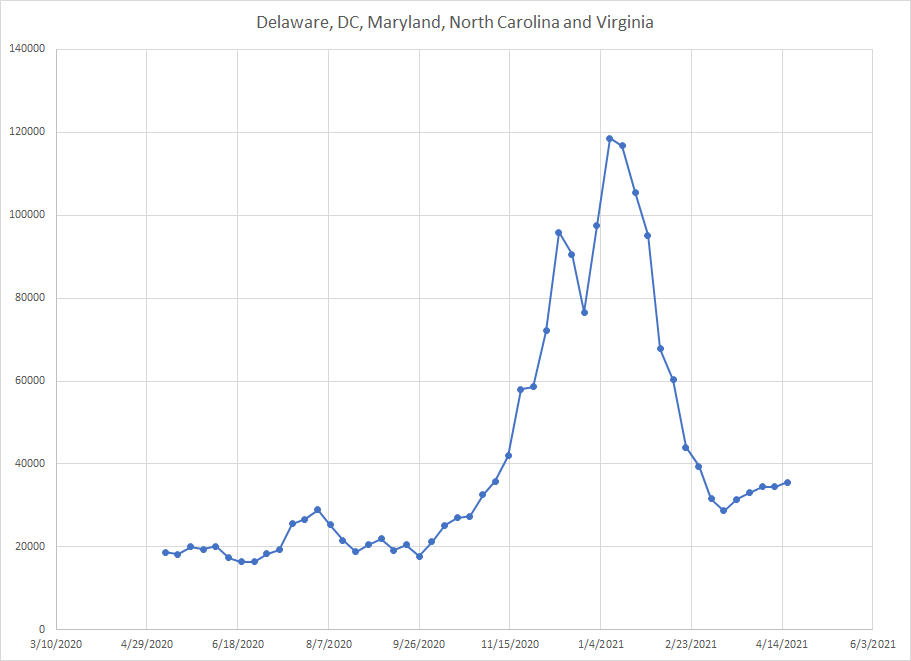 Moving down the east coast we get to this next group. Delaware and Maryland were the most concerning. Both are still showing increases but the rate of change has slowed. In this region, things have been going up for most of the last five weeks but still haven’t gone above late February levels so not a major area of concern.