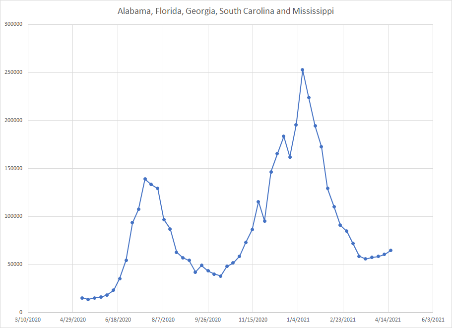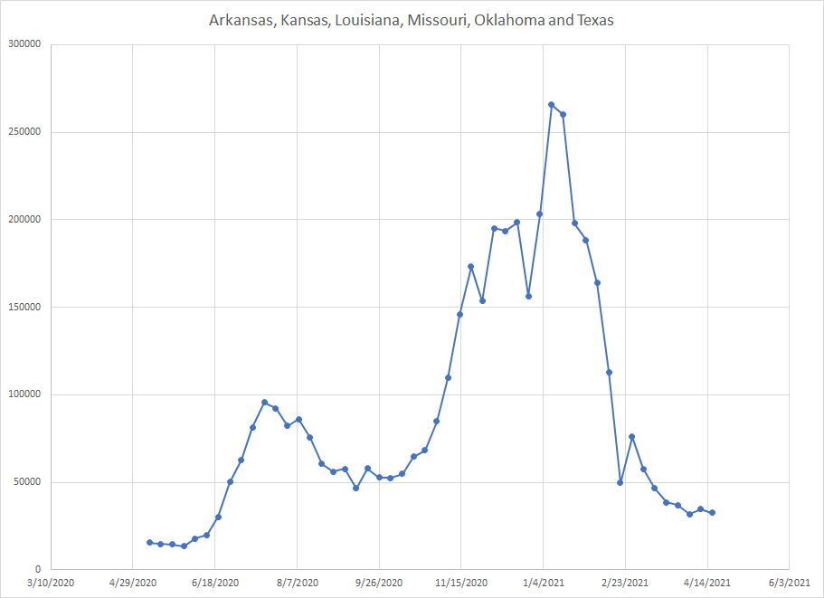 I’ve got some new graphs to show. These are weekly totals using the regions I’ve used in the past. The downside to these graphs is that states with large populations (California, Texas, Florida) can dominate a region.