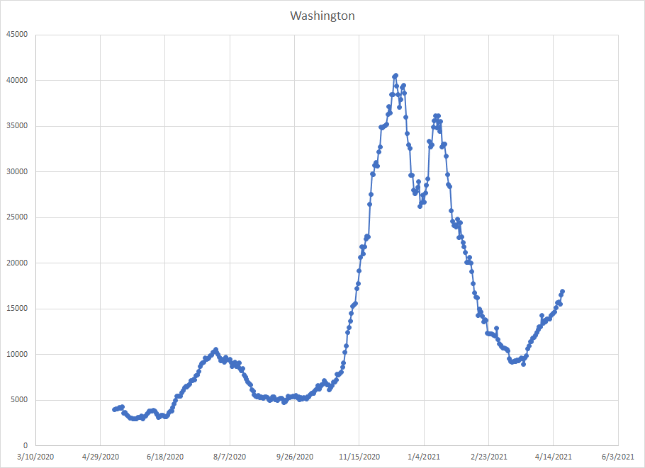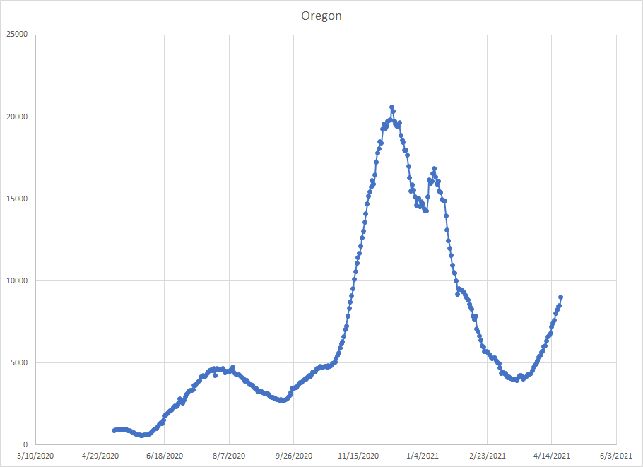 At this point, the only states to watch are Maine, Oregon, Delaware and Washington and maybe it is really just Maine and Oregon. Here’s what they look like. This is a graph of rolling two week case totals so it is slightly different than what I just presented. (Sorry I have problems with being consistent)