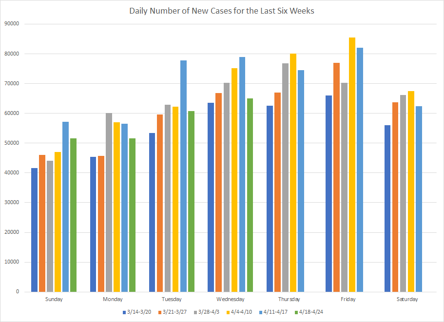 The dark blue bars are the week of March 14th and you see that they are lower than the rest of the bars on each day. The orange bars are the week of March 21st and you can see that the gap between the orange and blue starts to widen by the end of the week. The grey bars tend to be higher than the orange bars but we only see big gaps on a couple of days but things are still going up. The yellow bars are the first full week in April and they are higher than the grey bars on five of the seven days as cases continued to climb. Note that the highest bar is on Friday of that week which now looks like when things peaked.