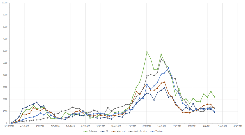 In this next group, cases were going up in both Delaware and Maryland although the increase in Maryland was a slow rise and not exponential type growth. Both dropped last week. Delaware has been in a up/down pattern for a couple of weeks but the general trend is still up so I’m not sure yet if things are over there. Maryland really broke the pattern and I’d expect cases will continue to drop there. The other three states in this group have been flat since they hit bottoms after the winter spike.