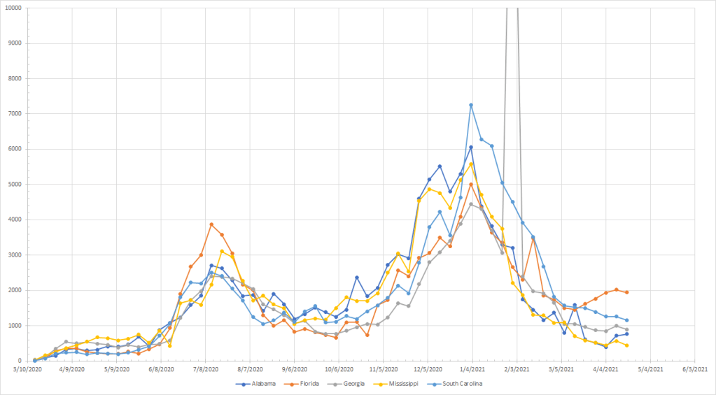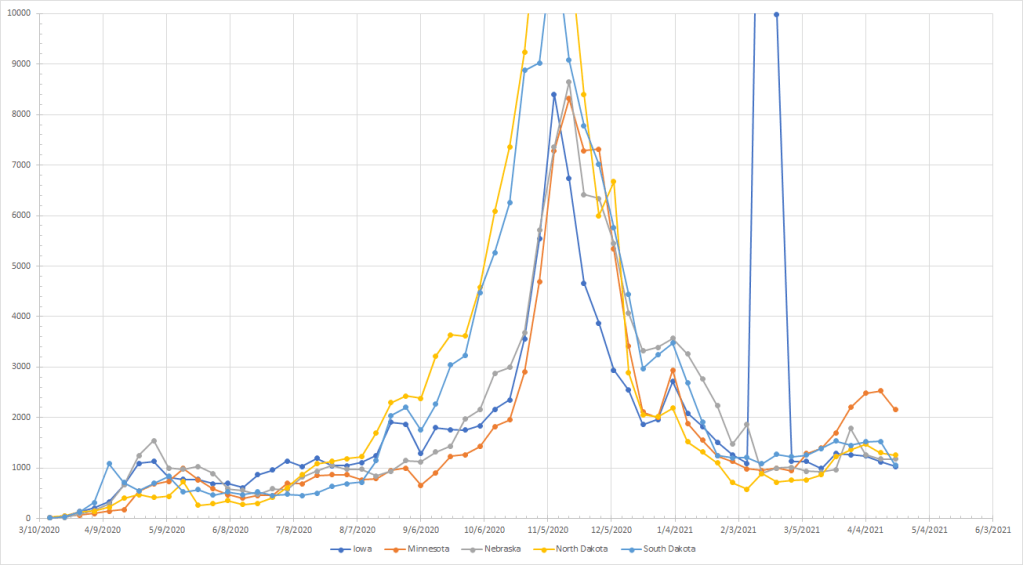 To the upper Midwest where Minnesota was looking like a problem but growth slowed two weeks and then cases dropped last week. The spike in Iowa is like Georgia in the graph above – an artifact of the change in sources. Other than Minnesota, no real increase was observed anywhere and the other states have been flat through March and April. Now that Minnesota has turned down, there aren’t any problems here.