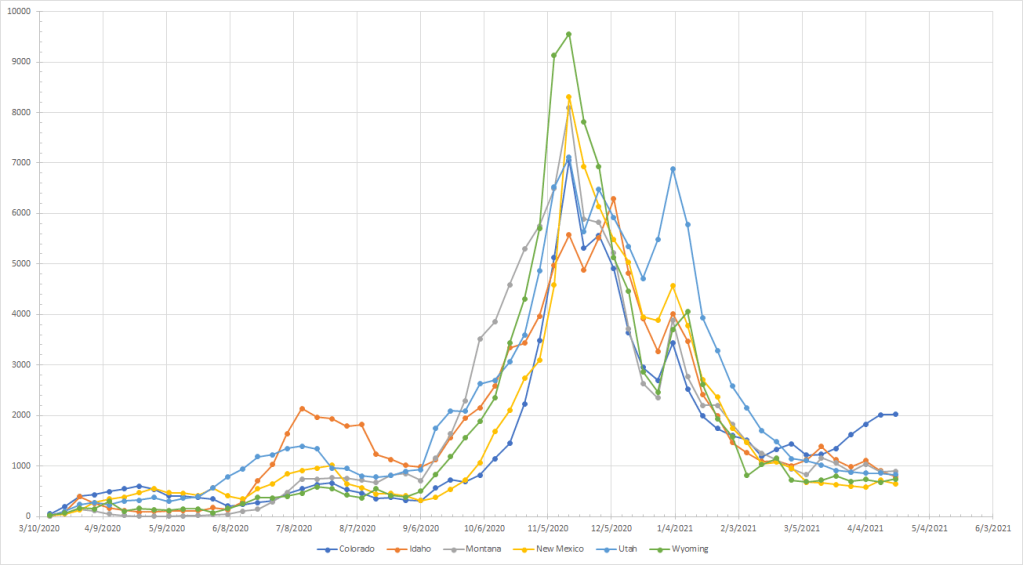 In the Rockies, Colorado stands out. Cases were up again last week but by a very small margin which could indicate a top. Will watch and see. All of the other states here have been declining or flat through March and April.
