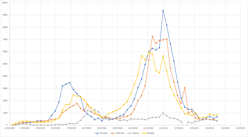 Now we have the Pacific Northwest which includes Alaska. Alaska did see cases rise in late March/early April but they have leveled off since then. Oregon didn’t look like a big problem until we saw the big jump last week while Washington has been steadily but slowly increasing through March and April. Oregon didn’t continue to see the big increase and Washington was just barely up so we’ll watch and see but neither one really looks like a big problem right now.
