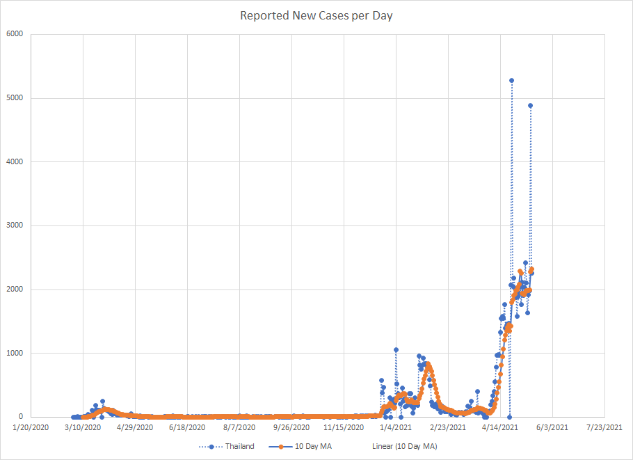 Next up is Thailand. Like the Seychelles, there were two large recent spikes in cases recently but the number of cases recently has certainly been at highs. But, even with those spikes, the moving average is not rapidly rising like it was earlier in April so it is possible they are at a peak.