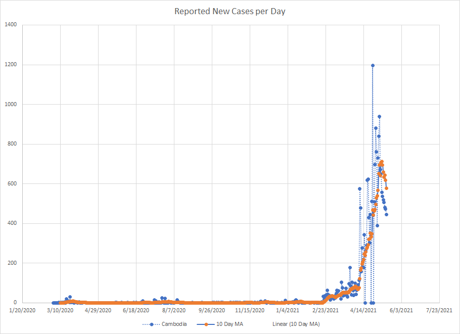 Cambodia is another example and one of the places driving the numbers for the Western Pacific region. They went months with almost no cases and then started to see things go up in February but the big increase started in early April. That lasted about a month and things are clearly dropping now.