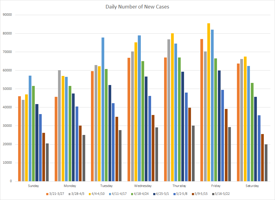 So I took the data and did it in a slightly different way. Instead of using days on the x-axis, I’m using the calendar week and then using bars for each day. Its a little better at showing visually how this week compares to previous weeks. And the downward trend is much more obvious here even with the day to day variations.