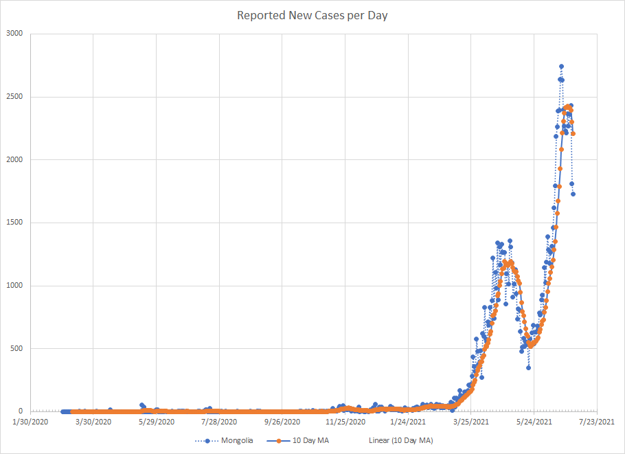 Vietnam had the biggest increase going from 7152 cases at the end of May to 16491 at the end of June. In second place was Mongolia which went from 57512 cases at the end of May to 113232 cases at the end of June. Graphs for both are shown below and both have been mentioned before. Neither one had a significant number of COVID cases until March of this year. Mongolia saw things drop but then turned around and increased to a higher peak although it looks like they are trending down now.