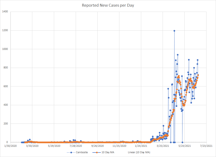Both places had a big increase starting in early April and have gone up and down through May and June but each finished with a new high in the average number of cases. In the WHO world, Cambodia joins Vietnam in the Western Pacific while Thailand is part of SE Asia. I’m sure they have logic for their boundaries.
