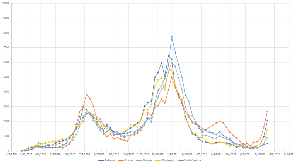 Cases are up sharply for the second week in a row in Florida and Alabama and Mississippi also saw a big jump. They are still below the peaks of last summer, but the waves of last summer saw cases increase for 4-5 weeks in a row. If that holds, they could easily pass last summer’s peaks. For some reason, Georgia and South Carolina are not yet seeing cases rise as strongly.,