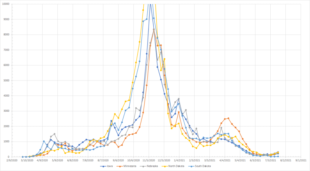I don’t know if the CDC is getting accurate information from South Dakota. They go for several days with 0 reported new cases. Outside of South Dakota, we see small increases in the other states but like the rest of the states in the north, the increases are hardly alarming.