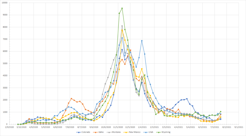 Here’s where things get a little interesting. I should mention again that these are all cases per million which adjusts for the different population in the states. Arkansas and Louisiana zoomed past Missouri this week to become the new biggest problems (along with Florida and Alabama). Missouri is interesting because they saw small rises for four weeks in a row and then two weeks with big jumps. Last week, the growth rate slowed which is good news. Not saying other states will automatically follow this pattern but it could mean that we see things start to slow in other places during this coming week.