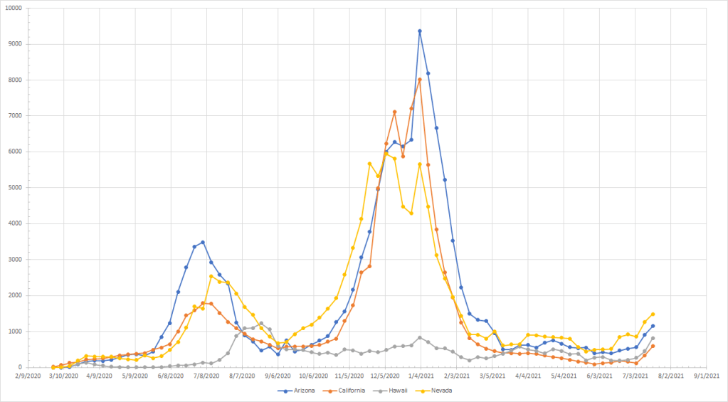 Let me give you the numbers. From Monday (7/12) through Friday (7/16) there were 172102 newly reported cases. In this past week, from Monday (7/19) through Friday (7/23), there were 264627 newly reported cases. That’s a 53% increase.