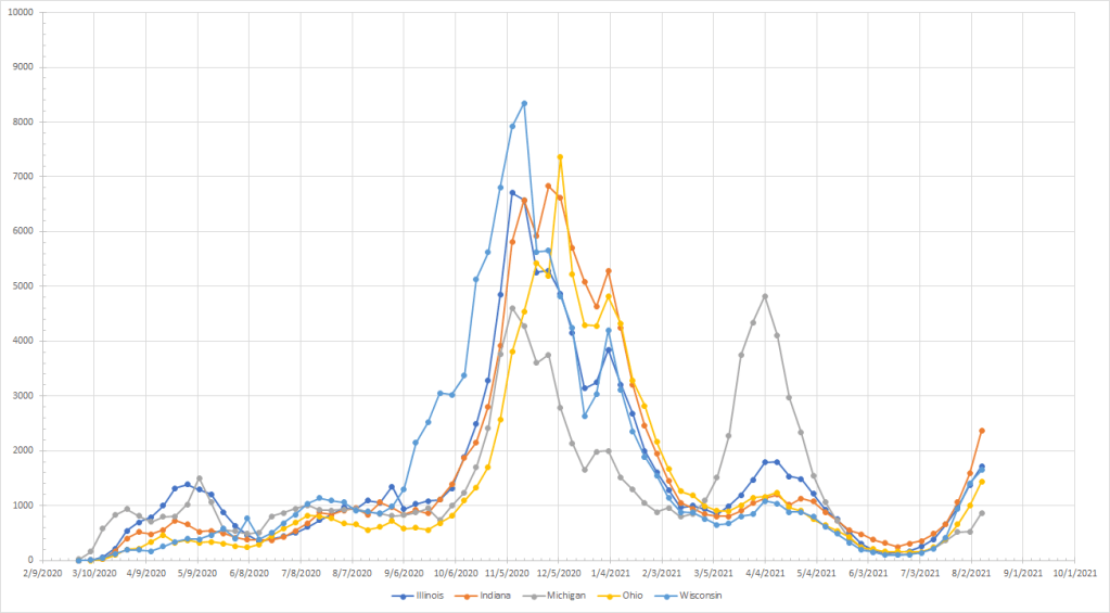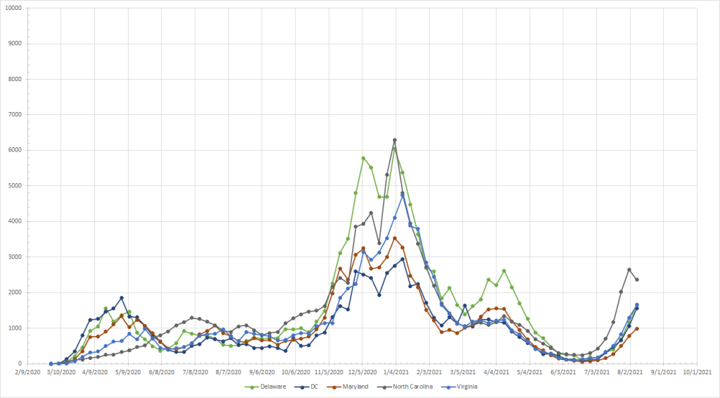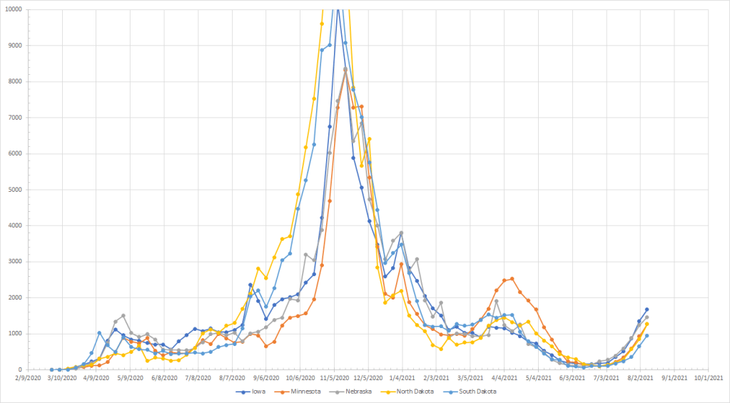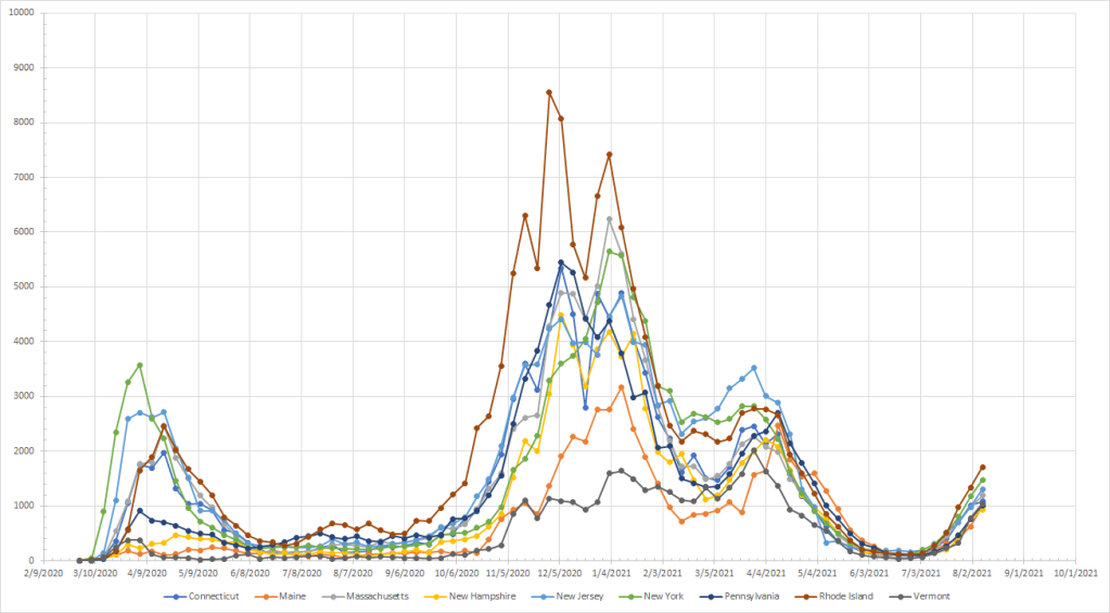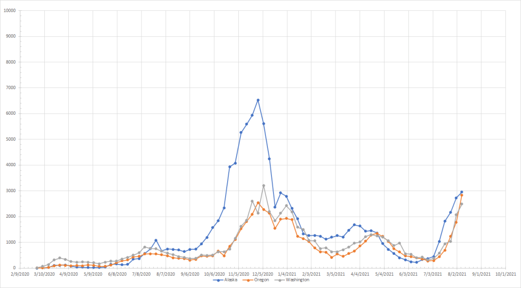 The virus certainly seems capable of making new patterns although past history here and in other places suggest that it takes several weeks to come down from a peak. And waves tend to last 8-10 weeks. This would mean that places like the Pacific Northwest and the Northeast will see peaks in September. Does that mean they’ll be declining in October and potentially November when we’d expect to see things going up? Or does it mean that we’ll get a short decline followed by a larger peak in the late fall/winter like we had last year? That’s what is unusual about the patterns we see in those places and I’m not going to hazard a guess at this time.
