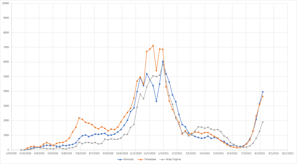 Moving down a bit we get this next group. (A reminder that these state groupings were defined by latitude and longitude) Last year, Tennessee did see an increase and had started to drop by this time while the other two were flat. They are all showing upward trends and are above last year. Tennessee may have slowed a bit since Kentucky passed them in terms of cases per million. West Virginia (16) is actually farther above last year’s total followed by Kentucky (18) and Tennessee (32).