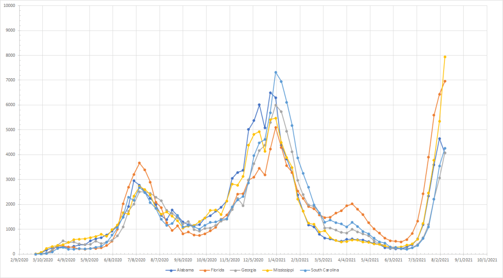 Now we get to the Southeast. Alabama turned down for the week and that does appear to be a real peak. Cases continued to rise in the other states although the rate of change in Florida slowed enough that Mississippi jumped ahead to lead the region. Both Florida and Mississippi are at all time highs for cases per million. Last year, at this time, they had all peaked and were heading down. Mississippi (9) and Florida (17) rank high compared to where they were last year and South Carolina (21) and Alabama (27) are in the top 30. Georgia (39) brings up the rear but Georgia started a little later and we will probably see cases continue to rise there.