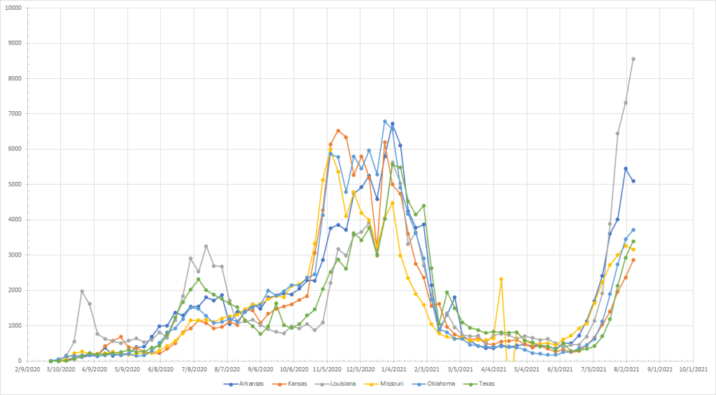The next region is where I combined a couple of smaller regions because I would have ended up with Kansas and Missouri in one region. Cases turned down in Arkansas and Missouri and those both look like real peaks at this point. Last year at this time the more southern states (Arkansas, Texas, Louisiana and Oklahoma) had dropped from peaks in July while Missouri and Kansas were more flat. Louisiana (8) is the farthest above last year and currently sits at an all time high. There is wide variation among the others – Arkansas (10), Oklahoma (20), Kansas (28), Missouri (30) and Texas (38). Overall, it looks like a region approaching peak values but all of the states are going to see peaks above last summer.