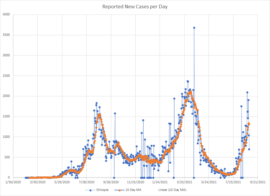 In the Africa region, I’ve got data from 45 places. Cases increased in August in 27 of them and decreased in 18. In fourteen places, the number of cases in August were more than double the number of cases in July. If I cut the list down to places with a “large” number of cases, the four that stand out are Ethiopia, Nigeria, Eswatini and Ghana.