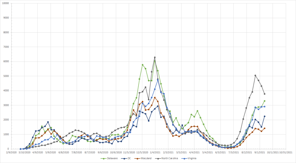 Moving down the coast, you see the contrast. North Carolina is down 25% from their recent peak and cases have dropped three weeks in a row. The other states in the region are all at peak values. But most of them aren’t really seeing big increases. Instead we see many of them in kind of a plateau where they’ve been for several weeks. The next weeks will be interesting here as well.