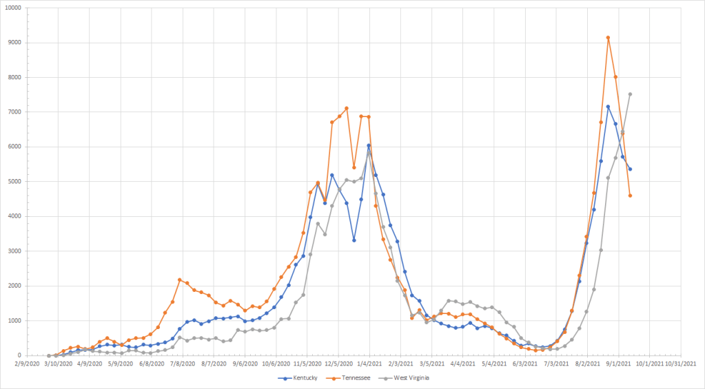 Another region where we see differences. Both Kentucky and Tennessee hit peaks during the week ending on August 28th. Kentucky is down 25% from that peak while Tennessee is down 50%. West Virginia, on the other hand, is at a new high and cases there have gone up ten weeks in a row. That could be a sign there are near the end.