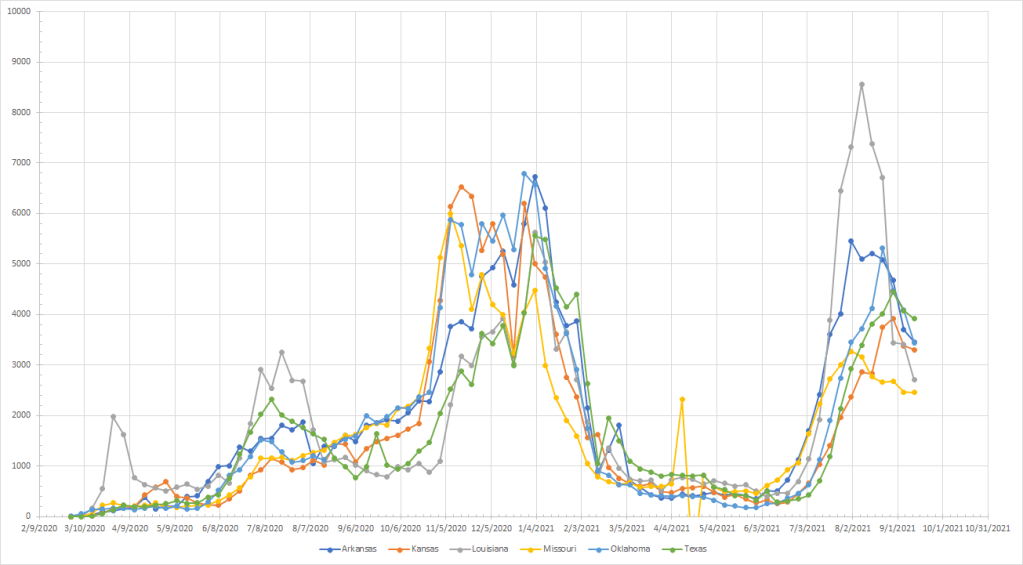Another region where cases are dropping everywhere but the size of the drop varies. Arkansas and Missouri peaked during the week ending August 7th and Arkansas is down 37% from that peak while Missouri is only down 25% from its peak. But the trends are clearly down in both states. Louisiana peaked during the week ending on August 14th and cases are down 68% from that peak. Oklahoma is down 35% from their peak. Kansas is down 16% and Texas is only down 12%. Still the trends across the region are for declining cases.