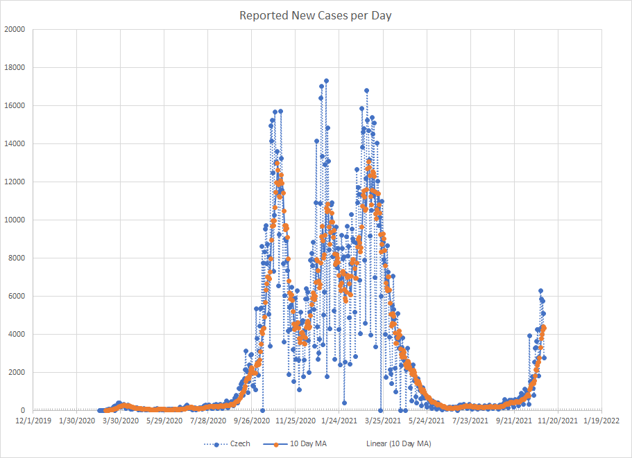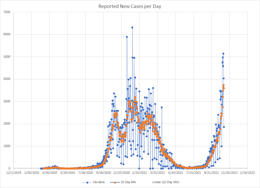 Coming in fourth was Slovakia which had a total of 17586 cases in September and 71266 in October for an increase of 305%. But we have a much different story than the other two countries discussed above. Slovakia has blown past the peak they saw last year and currently sits at a new high for average number of cases. And some of the recent days have been among the highest in terms of new daily cases. For what its worth, Slovakia does lag behind the other two in terms of percentage vaccinated (42% vs 52% for Poland and 57% for Czechia).