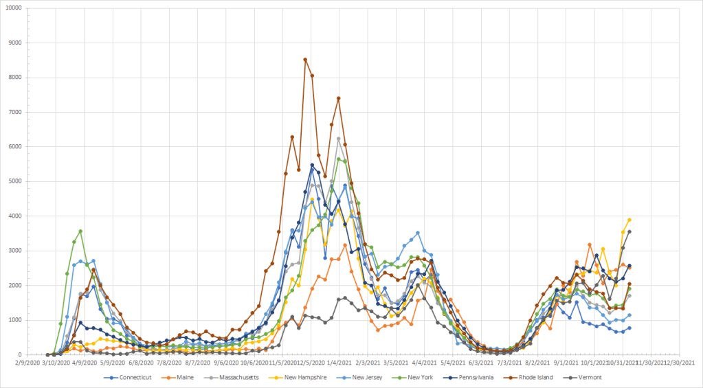 - New Hampshire (45) – Smaller increase than Vermont (maybe approaching a top) but one of the highest number of cases in the country. (Again per million people)