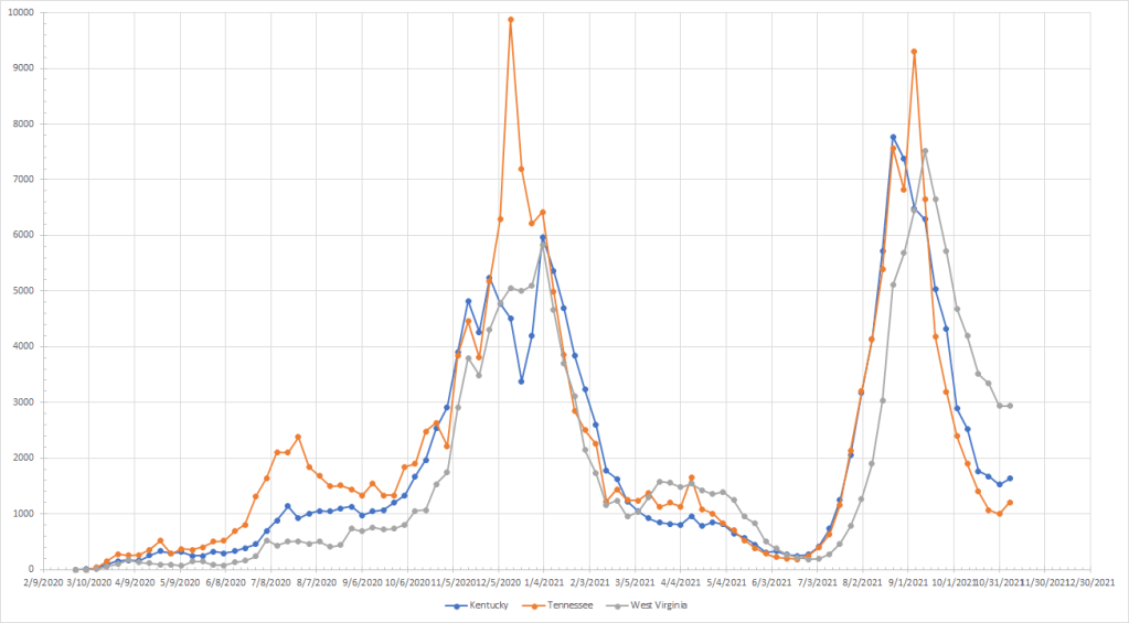 - West Virginia (26) – Also saw a very slight increase in cases. Could be all three states hit a bottom with West Virginia failing to fall as much as the other two. The higher case numbers leads to them being ranked worse than the other two.