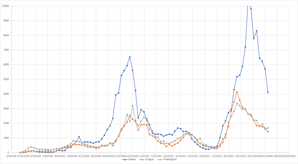 - Alaska (10) – My method of combining the scales isn’t a simple average so it will give extra weight if you rank low in one of the scales. Alaska still has one of the highest number of cases in the country but cases have been rapidly falling for over a month. That’s why they sneak into the top 10.