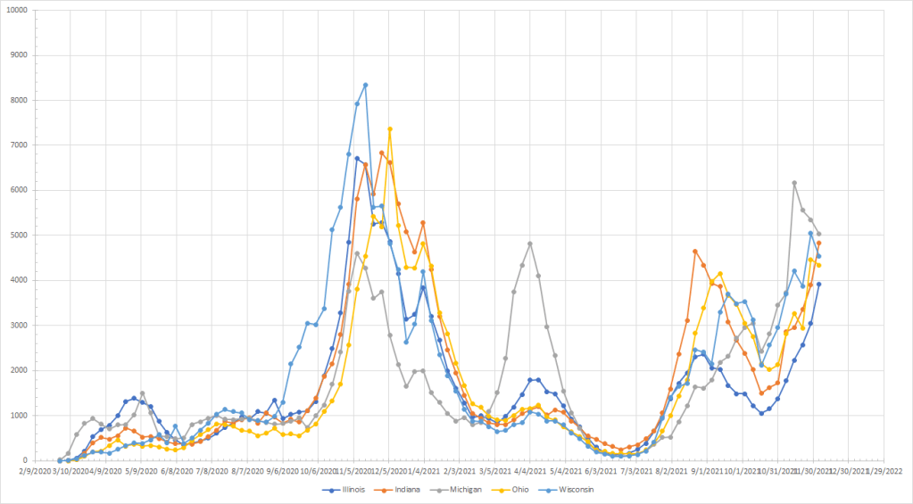 Interesting region as two of the three states saw cases drop last week which may just be the Thanksgiving disruption working itself out. Now looking better than the states just to the east on the Atlantic Coast but we have to see another week or so to confirm that cases are no longer going up.