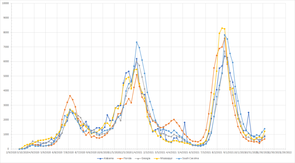 - Mississippi (21) – biggest weekly and monthly jump in the region but fewer cases than South Carolina.