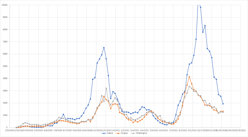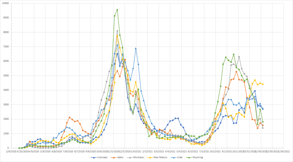 We have to start with a caveat because any discussion of trends can’t account for significant changes to the current situation that could have a big influence on the numbers. By that I just mean that the US has just started to see cases of the new Omicron variant. When this hit South Africa and neighboring countries, we saw an explosion in cases which could certainly happen here.