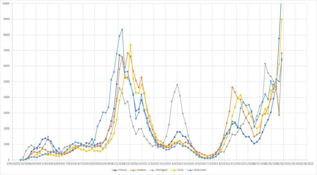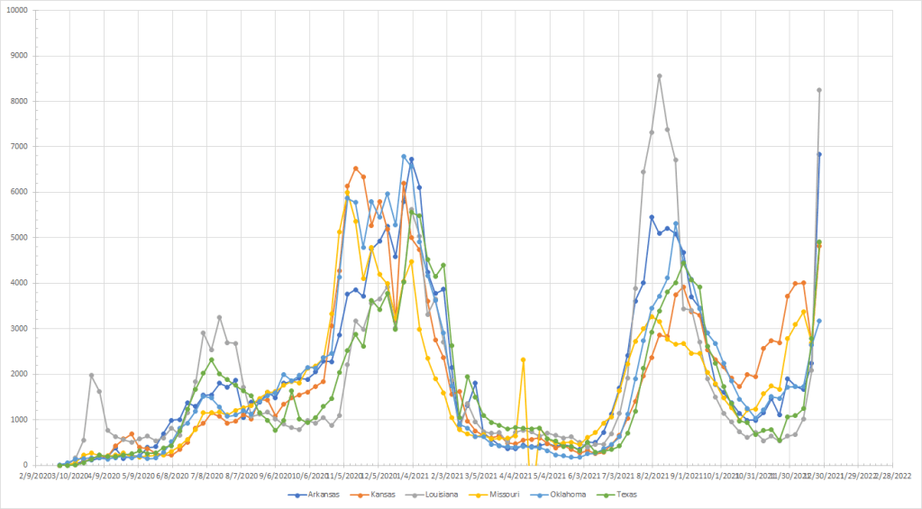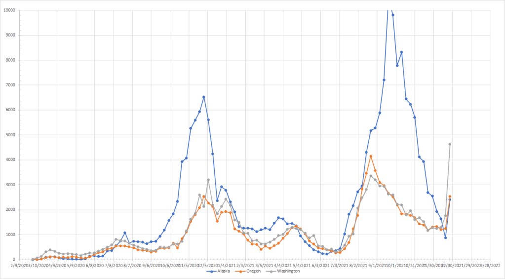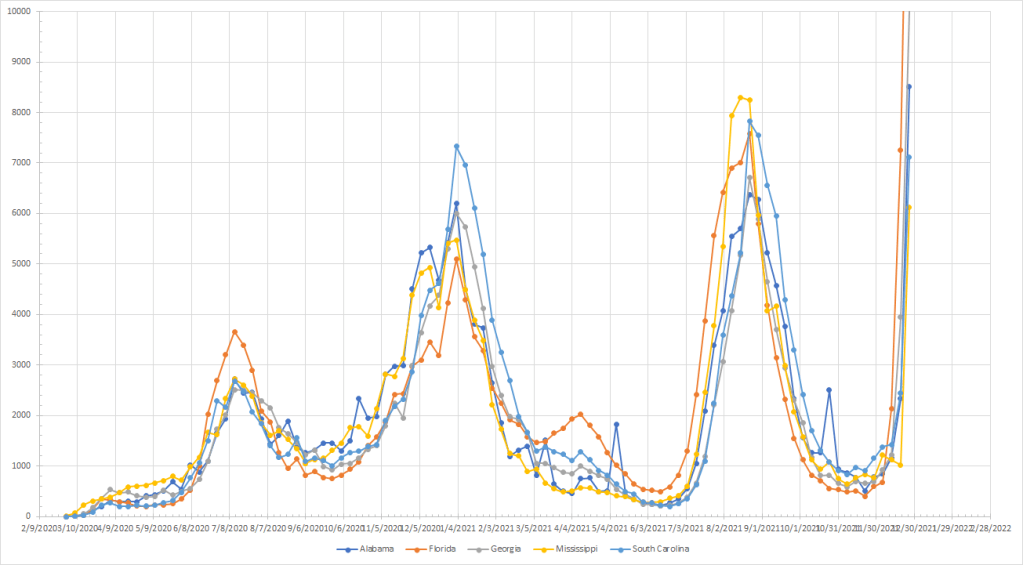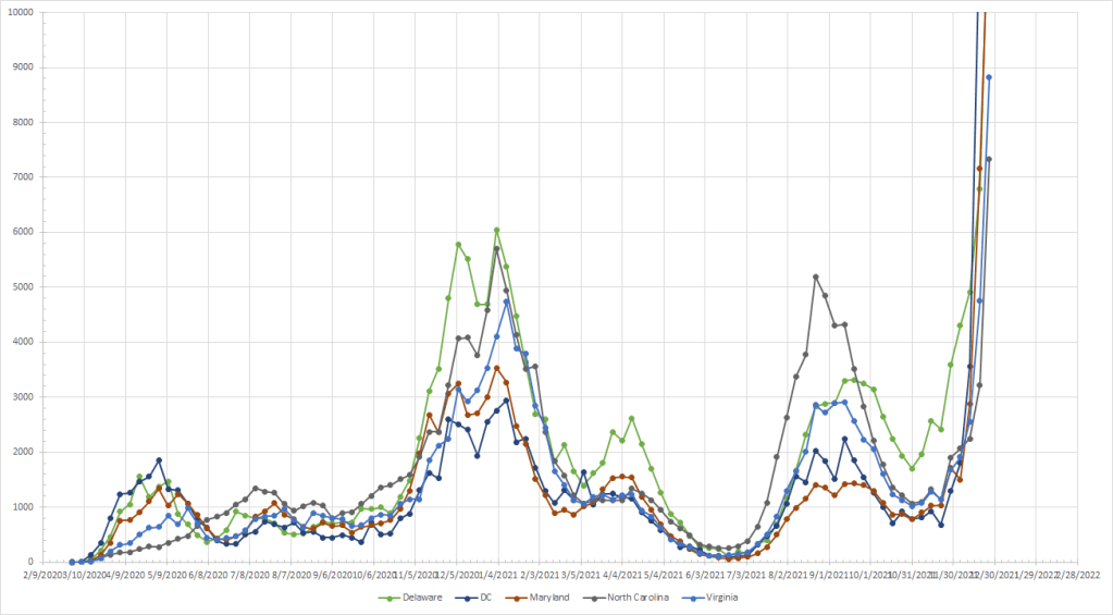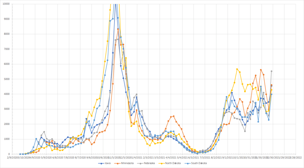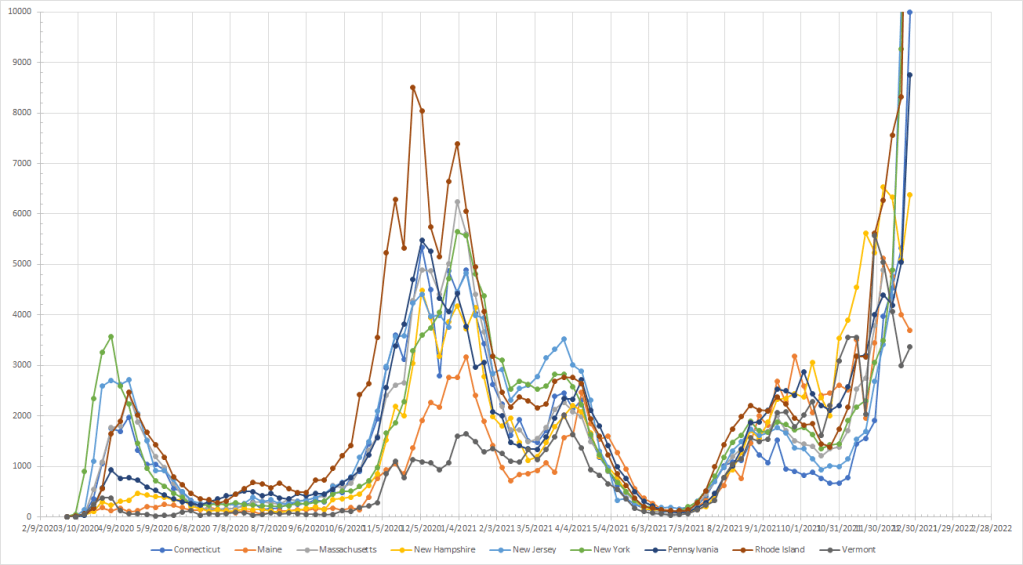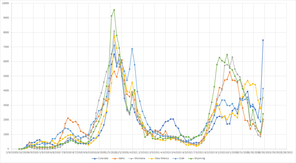 I’ve run the numbers but let’s just say things are exploding almost everywhere. Allowing for the possibility of still seeing some disruption, Maine was the only state that saw cases drop last week. The “cooler” spots are in northern New England and the northern Rockies. I’ll provide my current rankings but without a lot of comment because things are up pretty much everywhere.