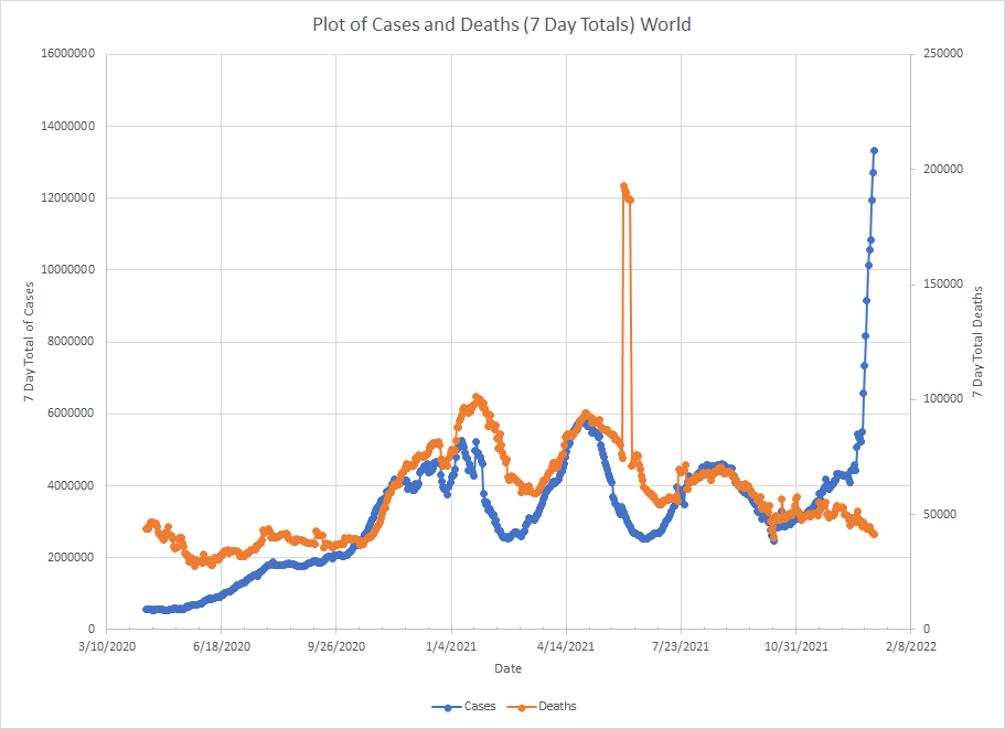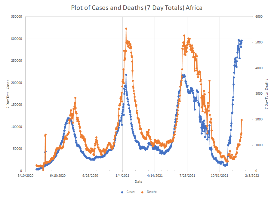 Reporting in some countries in Africa is spotty so we only get updates once a week or less and that creates some choppiness in the graphs. Still, you see peaks in cases in January and July of this year followed by peaks in deaths. It looks like the Omicron wave started in late November and may have hit some kind of peak as we aren’t seeing cases increasing.