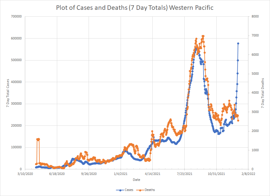 Then we have the Western Pacific region which includes China, Japan and down to Australia and New Zealand. Right now, Australia is one of the bigger drivers in cases. The wave started in early November but really didn’t start going vertical until late December. We did see an initial rise in deaths but they have actually started to fall lately.
