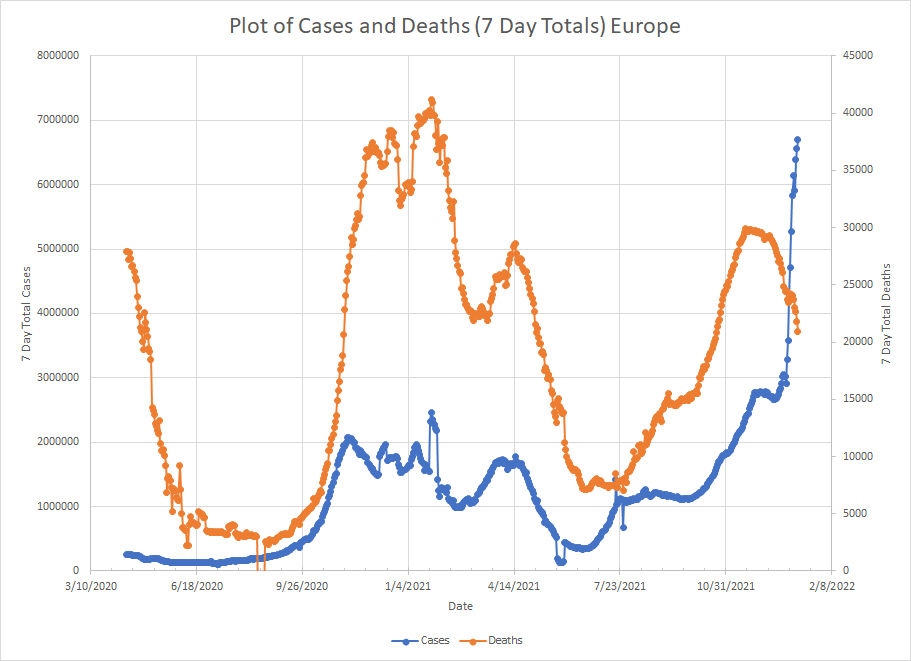 Then we have Europe. They started to see a wave in late September which looked like it was peaking in late November. Then, things really started taking off in late December. They saw a steady increase in deaths actually starting in late July and it reached a peak in late November about when cases started to flatten. But, since then, as cases have gone way up, deaths have actually been dropping.