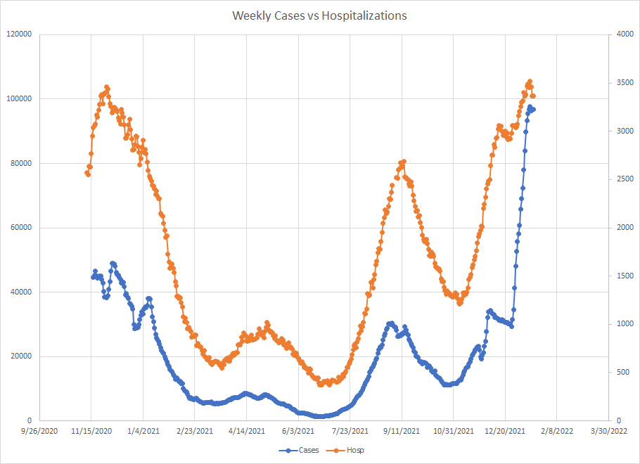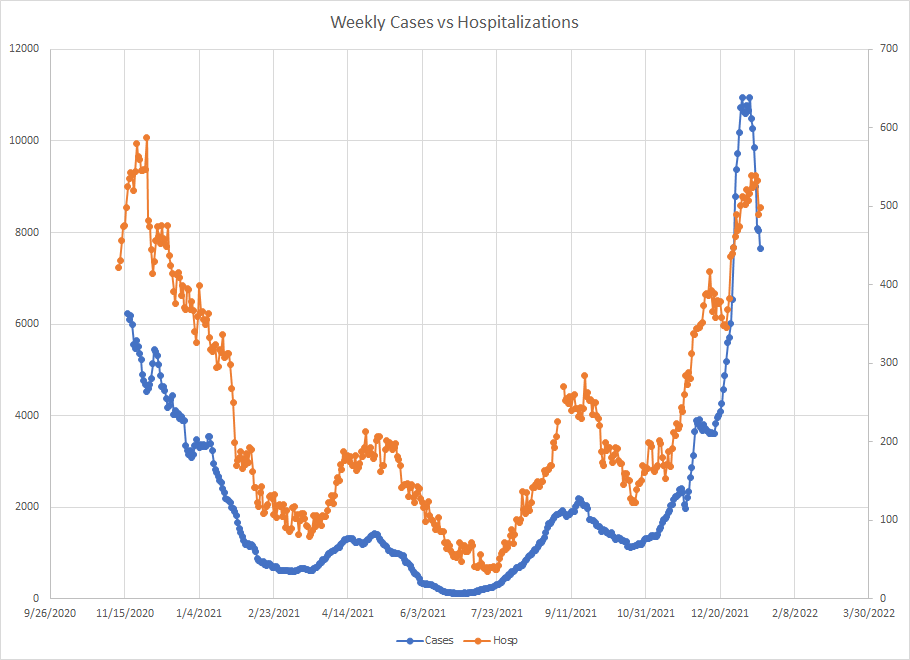 I started this in November of 2020 right at the peak of that fall wave. You can see the Delta wave that got me back in September. Then, we had a second Delta wave starting in October until Omicron took over in December where you get the almost vertical line. While hospitalizations did pass the fall of 2020, what is also interesting to note is the gap between the lines narrowed. If I tried to do some kind of normalization to cases, it would be clear the percentage of people hospitalized is down.