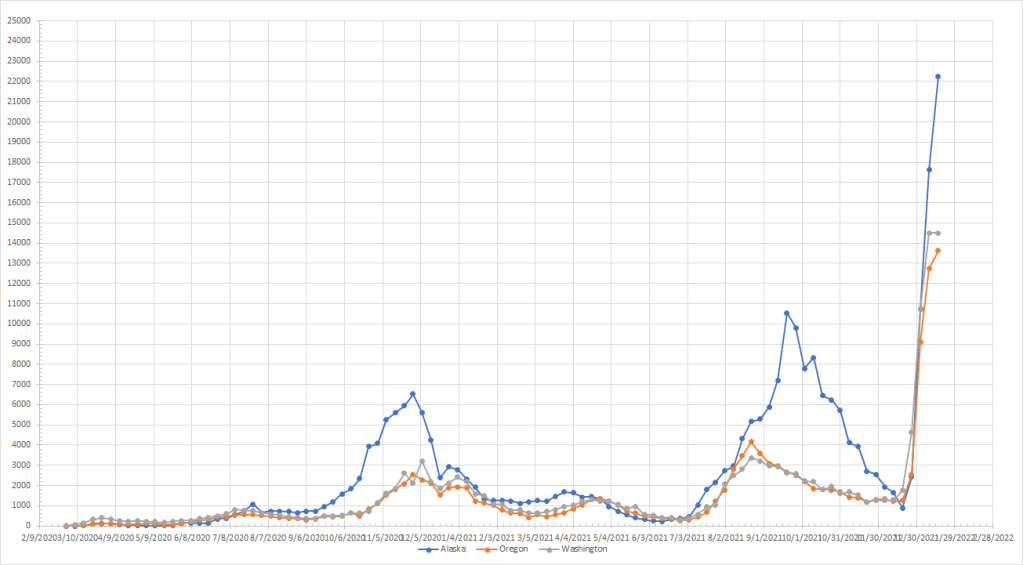 The state graphs have been redone with an expanded y-axis which will just make the difference between Omicron and previous variants more obvious. The list of states has reversed from several weeks ago as the states in the Northeast that were among the first to see the Omicron wave are now seeing cases drop and they make the top of the list.