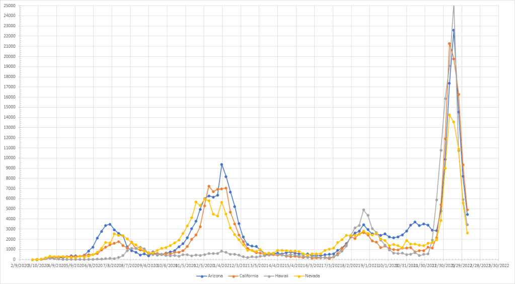 The ten states with the lowest number of cases per million were Maryland, New Jersey, New York, DC, Connecticut, Ohio, Rhode Island, Illinois, Delaware, Nebraska and Indiana. I gave you one extra since DC isn’t a state. Most are in the Northeast where we saw the first big Omicron breakout but it is has started to spread to the Midwest as well.