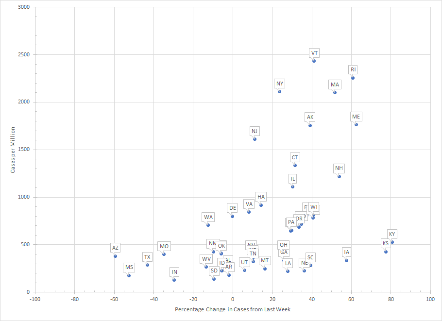 Here is the graph showing cases per million against weekly change. A few places aren’t on the graph. DC had a big spike and I’m always leery of one time changes. Wyoming actually reported negative COVID cases for the week which is a correction of previous data so they fall off the chart.
