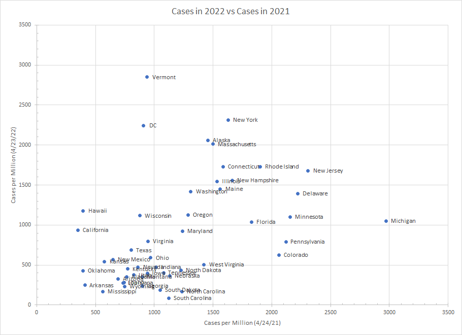 Just for fun, I’ve got a new graph showing 2022 vs 2021. So this is cases per million for last week vs the same week last year. Missouri didn’t make the graph because they had a reporting correction this time last year and showed negative cases so I didn’t expand the graphs into nonsense territory.