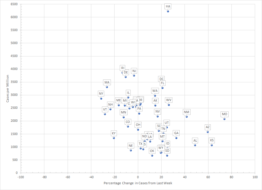 Here is the graph showing percentage change vs cases per million. I want to call attention to Hawaii which is still seeing cases go up and now stands out from the rest of the country. For the longest time, Hawaii had very low numbers. They really didn’t see their first wave until July of 2021. They had a big winter wave later in the year like the rest of the country and now they are seeing cases rise again with this peak already being higher than the summer of 2021 wave.