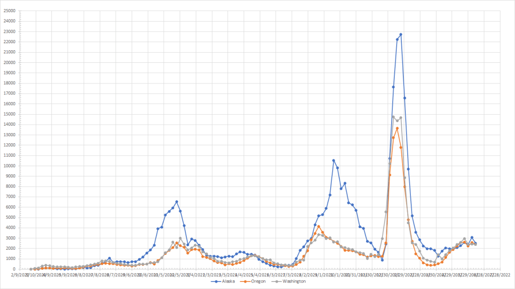 I’ll just finish with one last graph showing the Pacific Northwest where cases are high relative to the rest of the country and have been flat there for several weeks. Last year, they hit a low in early March and then we had a small bump in the spring with cases declining to another low at the end of June before another wave started. This year, we’ve not seen the second drop off and cases have been flat for several weeks so we didn’t get the sharp peaks we saw in previous waves. Just another way this spring and early summer has been different.
