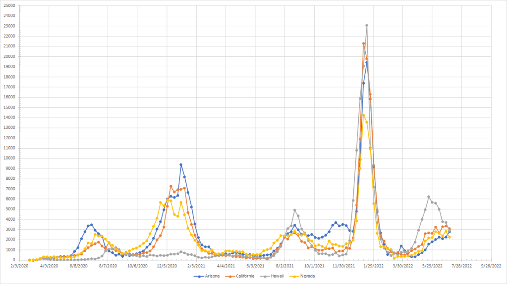 In this region, we continue to see cases drop in Hawaii and they below California in terms of cases per million. Arizona is the only state seeing cases go up – they’ve been flat to slightly down in Nevada and California. But Arizona, California and Hawaii still rank in the top ten for the most cases per million in the country. The trends this year look similar to last year although Hawaii peaked earlier and at a higher point than they did in the summer of 2021.