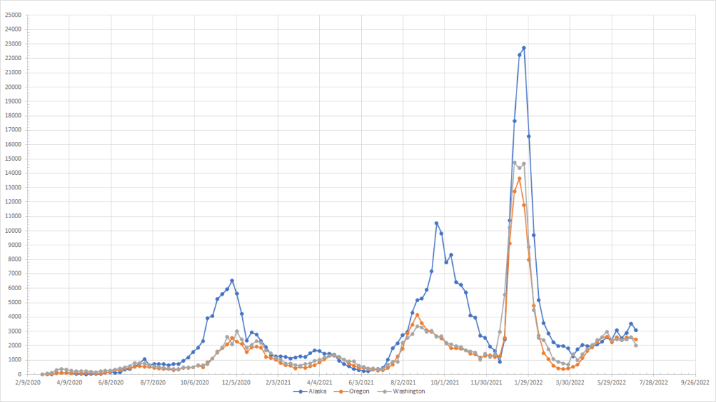 In the Pacific Northwest, cases are done from a month ago but still seem to be essentially flat. Washington did see a bigger drop last week but we’d need more data to confirm. Cases remain high in Alaska as they have for many weeks but Washington and Oregon no longer rank near the top ten. And the pattern is different from the summer of 2021 when all three saw cases rise from early July into August or September. Right now, Alaska doesn’t look like they are going to be anywhere near to the peak they saw in 2021.